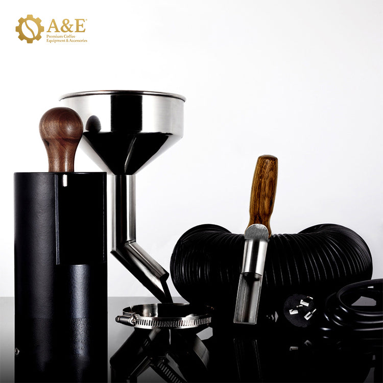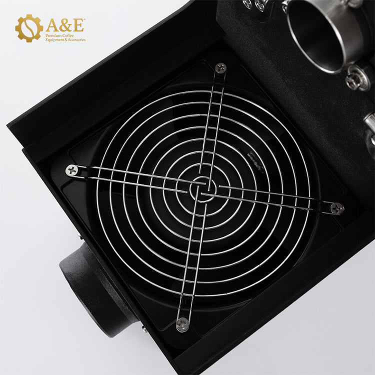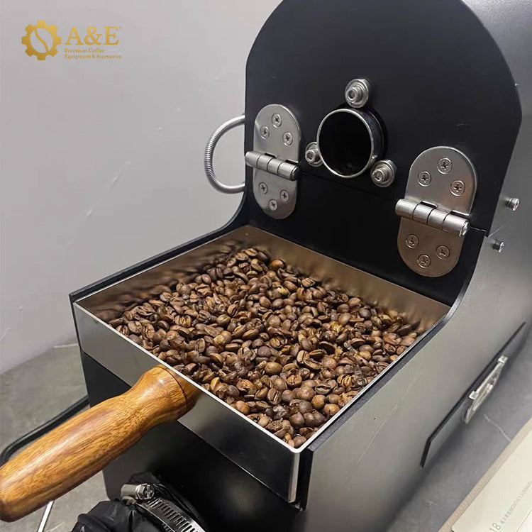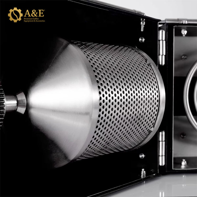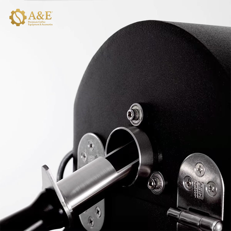 TANK-200 is a coffee roaster perfect for small samples, shops, and coffee lovers at home. It's easy to use, takes up little space, and ensures consistent results. With its electric drum design, it brings out rich flavors and aromas in your beans. The screen shows power, bean temperature, ROR, and timing. You can adjust the heat easily with the knob. It's equipped with a fan for cooling and a buzzer for overheating alerts. Plus, when used with a smoke exhaust barrel, it clears smoke and collects silver skin.